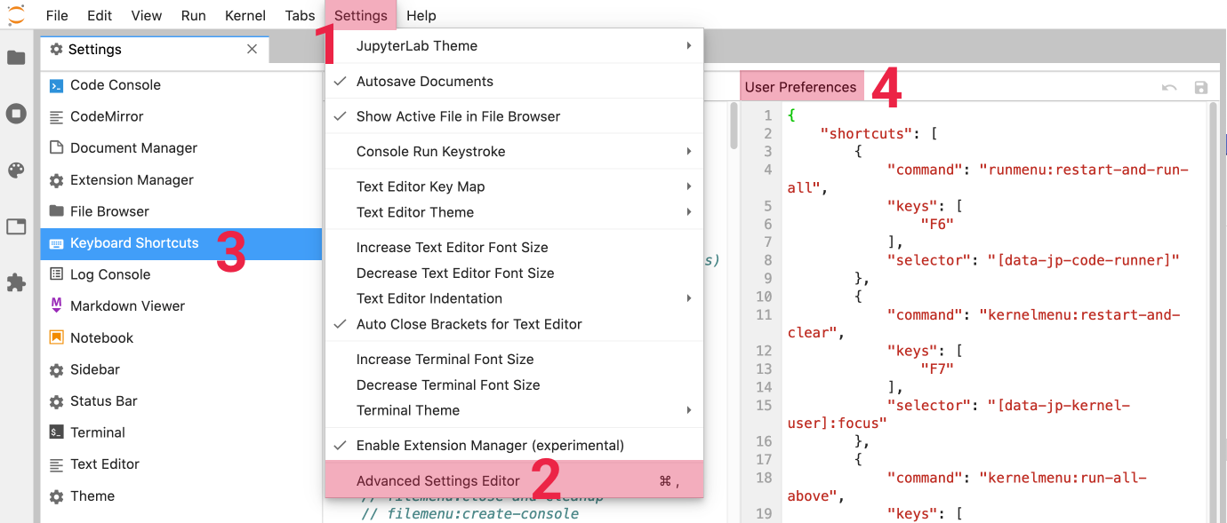 If you haven’t edited your Jupyter Lab shortcuts before, you’ll have nothing in the User Preferences section.